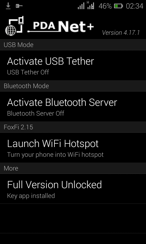 • Run it on your Android device and select the connection method you want to use. There are three different options (USB tethering, Bluetooth tethering and WiFi tethering)
